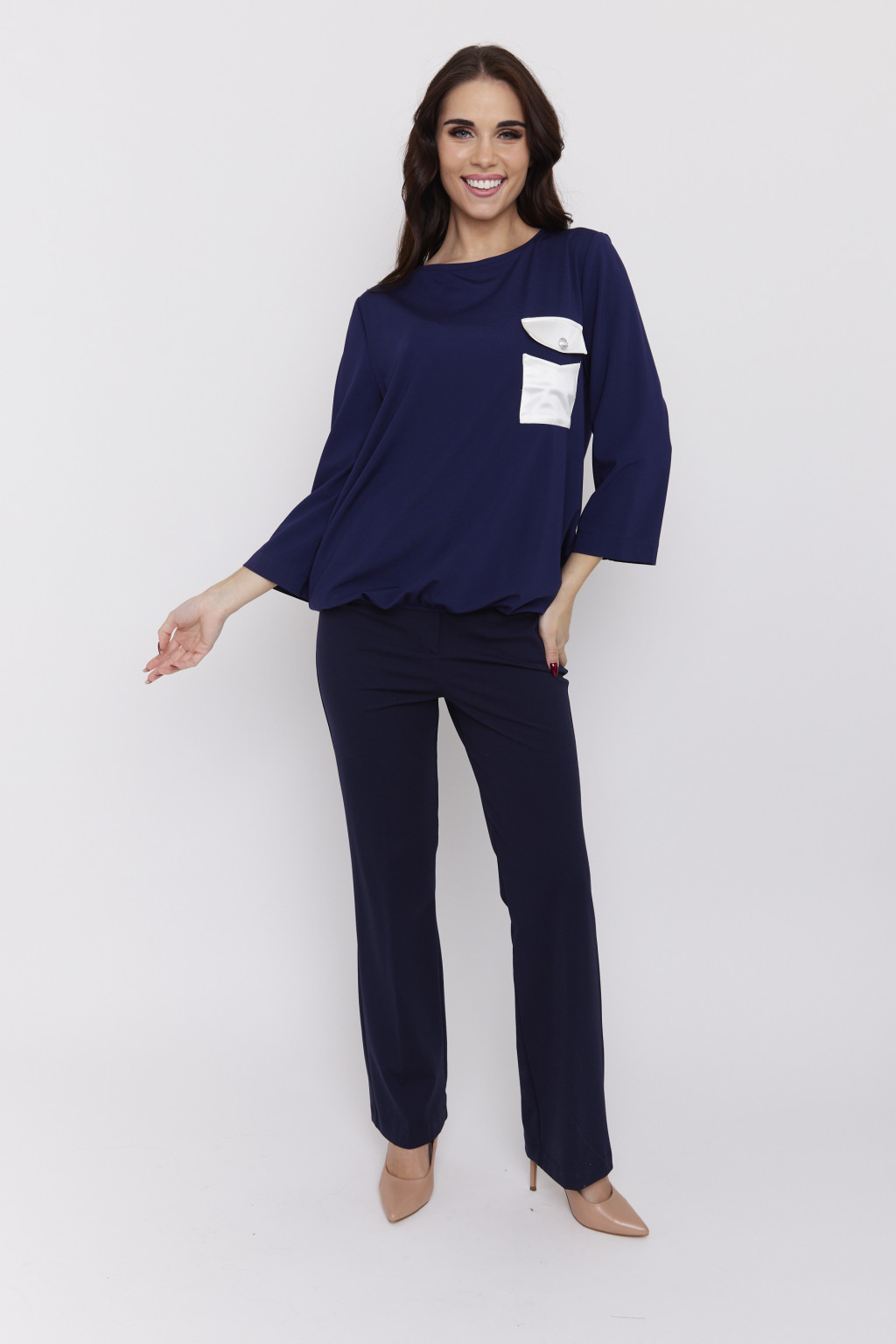 JANE női felső – gumis aljú, zsebes, csónaknyakú tunika szatén részlettel,sötétkék,S-M,CURVE Kollekció