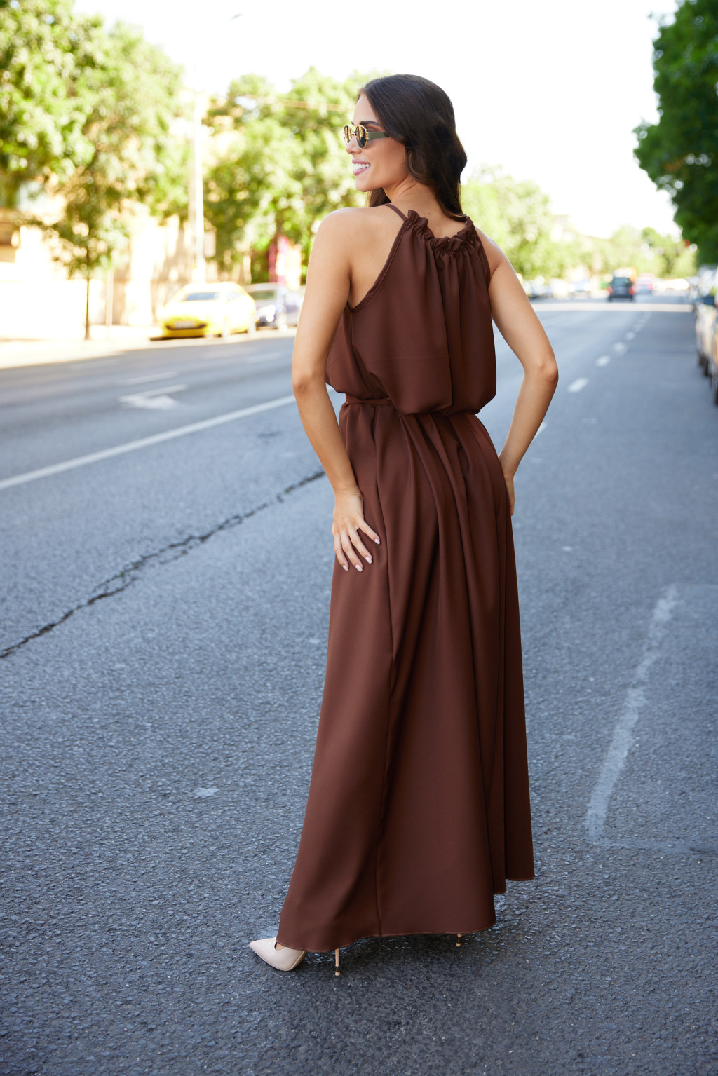 Miami női ruha, húzott nyakú maxi ruha,barna,Tara x Viktori, Young & Free Kollekció