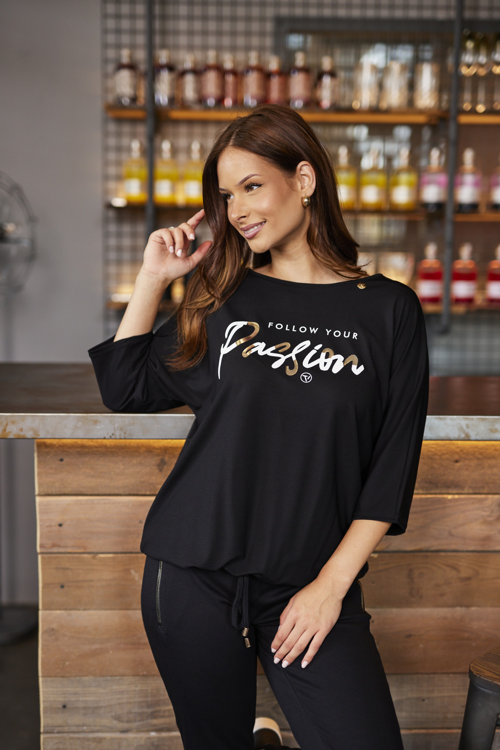 VIGO női felső– filmnyomott, húzott aljú felső,fekete,M,Tara X Viktori, Young&Free Kollekció