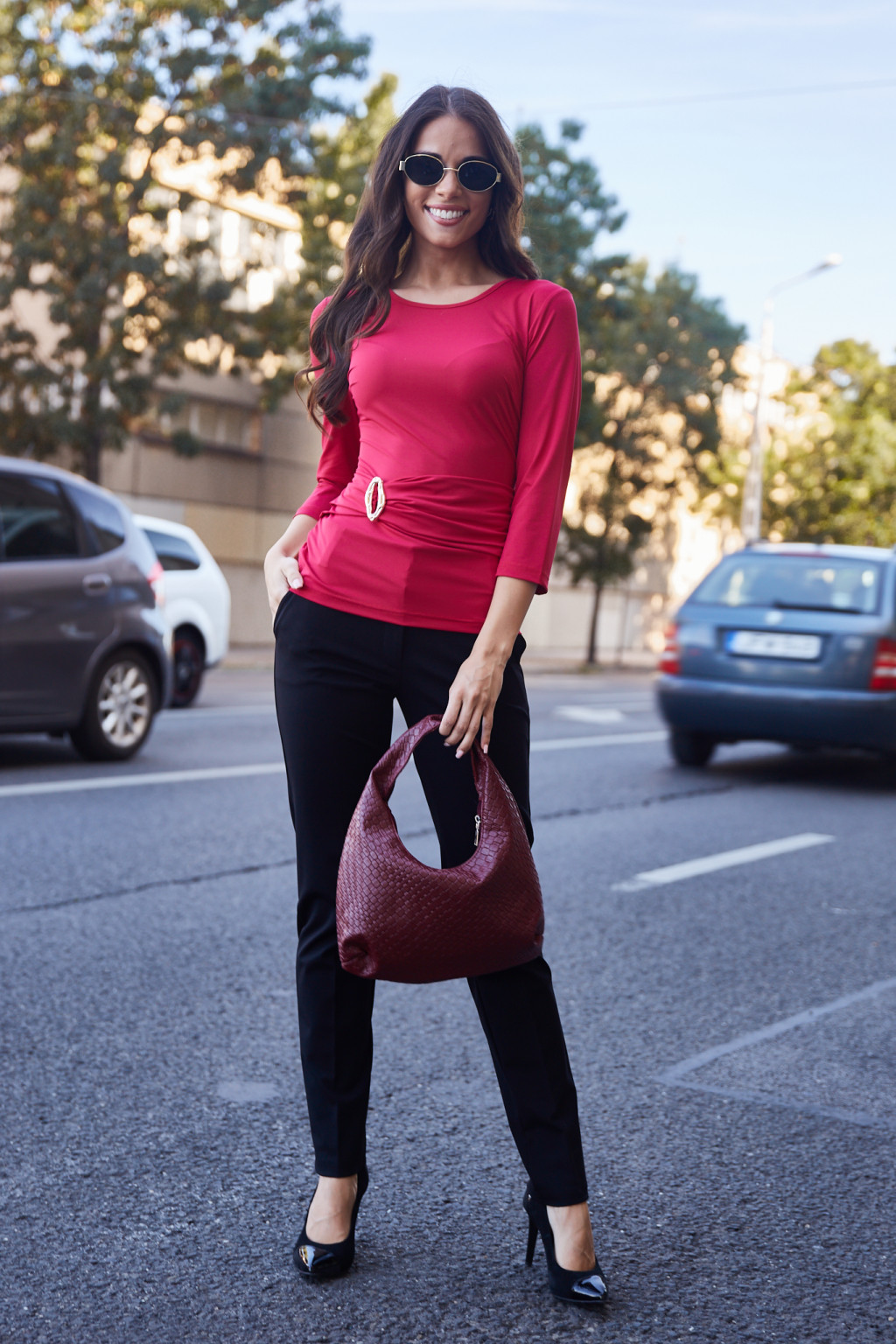 Michelle női csavart derekú, csattal díszített elegáns felső,bordó,L,Tara X Viktori,Young&Free Kollekció