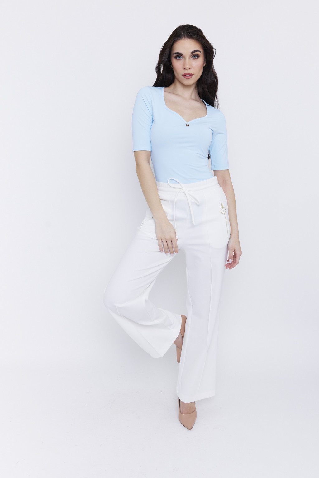 Hédinke női póló ívelt rollni pántos részlettel, ívelt V-nyakú, testhezálló fazonú női felső, kék,S,Tara x Viktori