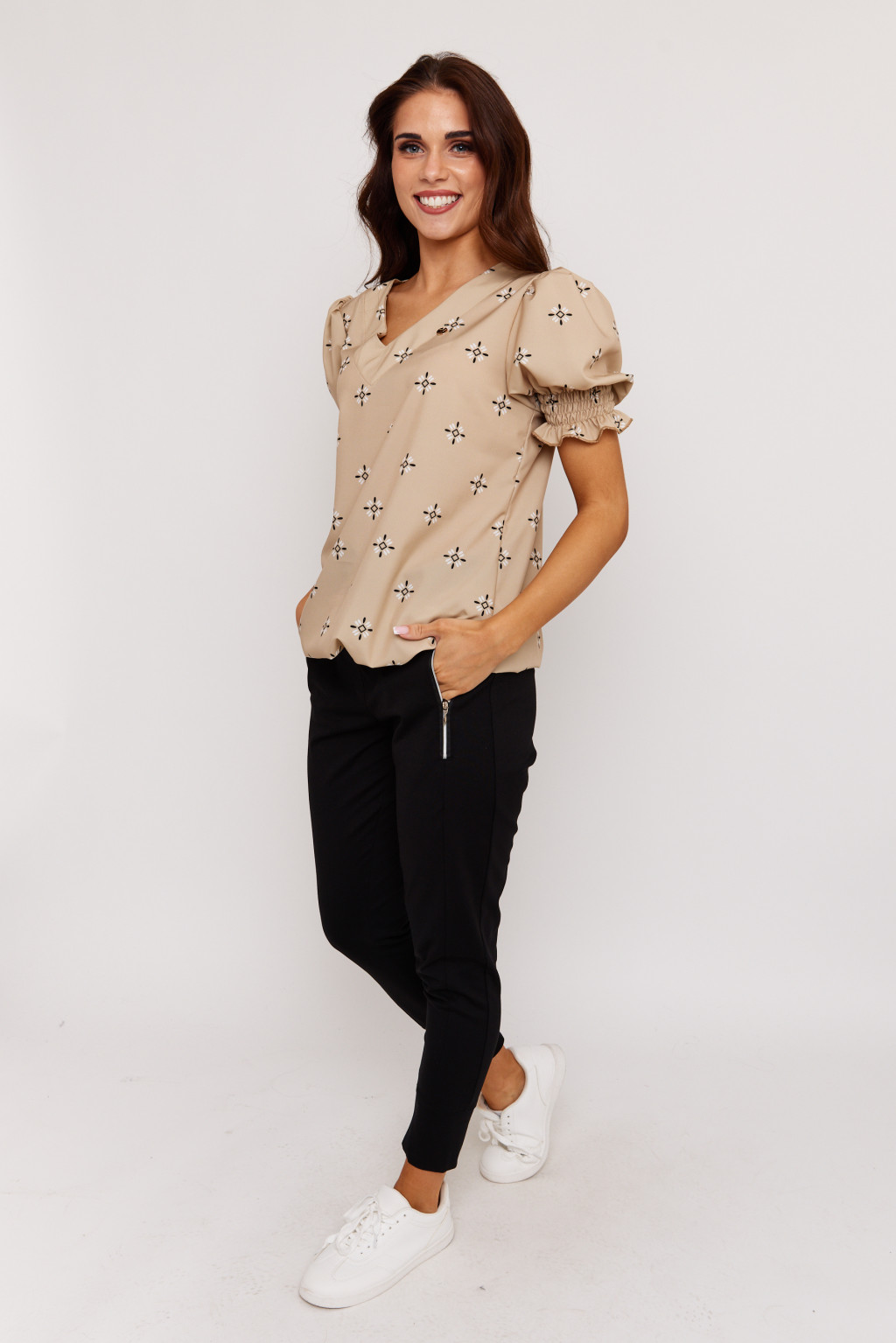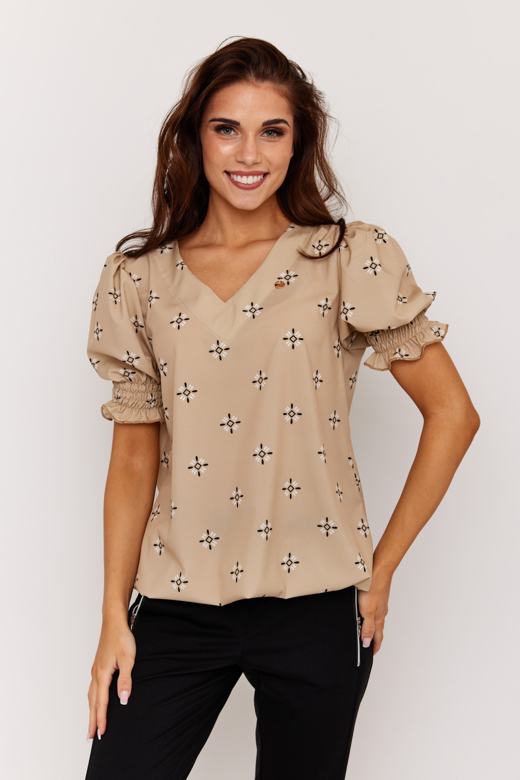 Pomona női blúz, V-kiváságú cérnagumizott ujjú gumis aljú női felső,mintás,S-M,Tara x Viktori