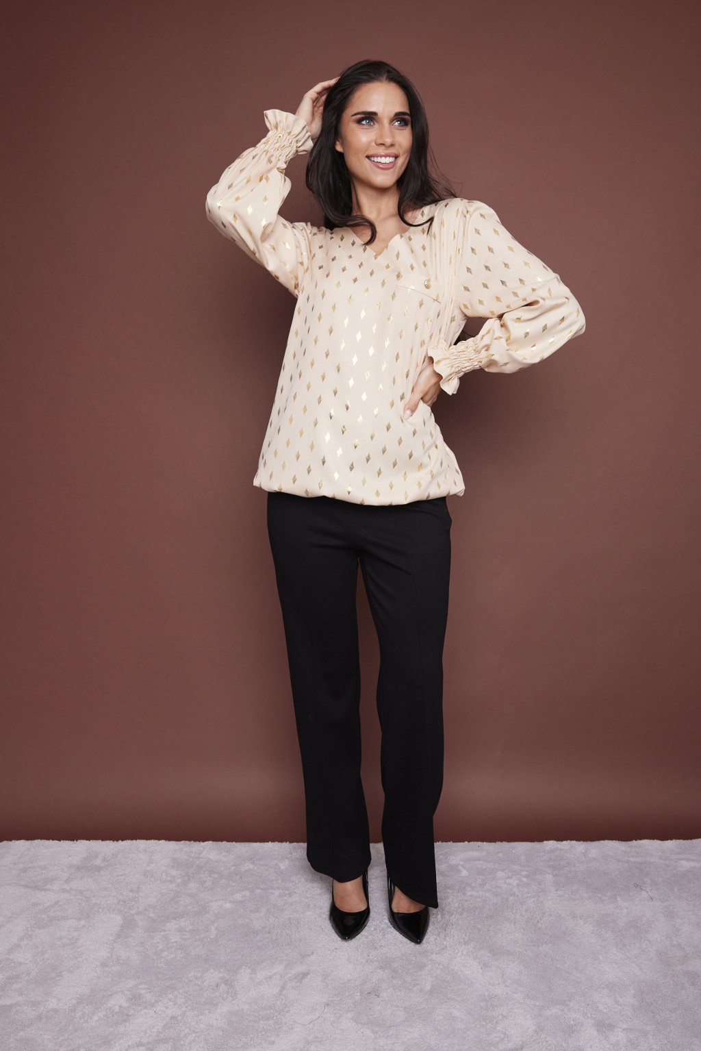 Pomona mintás női blúz V-nyakkivágással és gumírozott ujjakkal,bézs-arany mintás ,L-XL,Tara Collection X Viktori