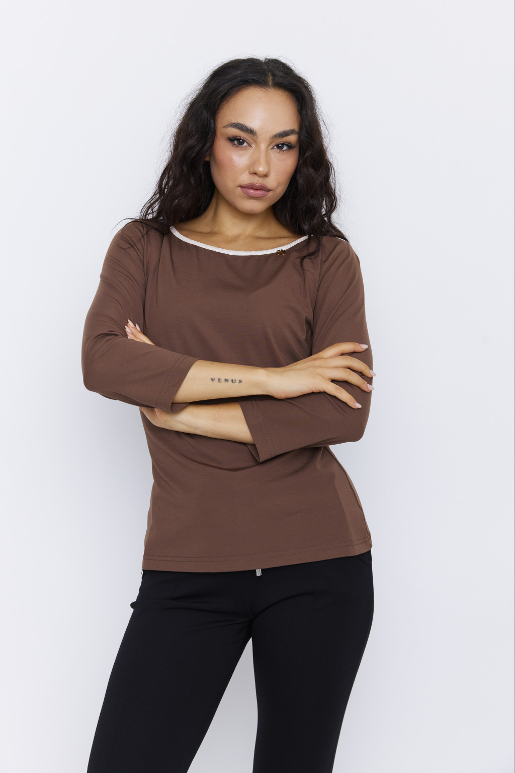 SPRING női póló – csónaknyakú, csillámos pánttal,barna,M,Tara X Viktori