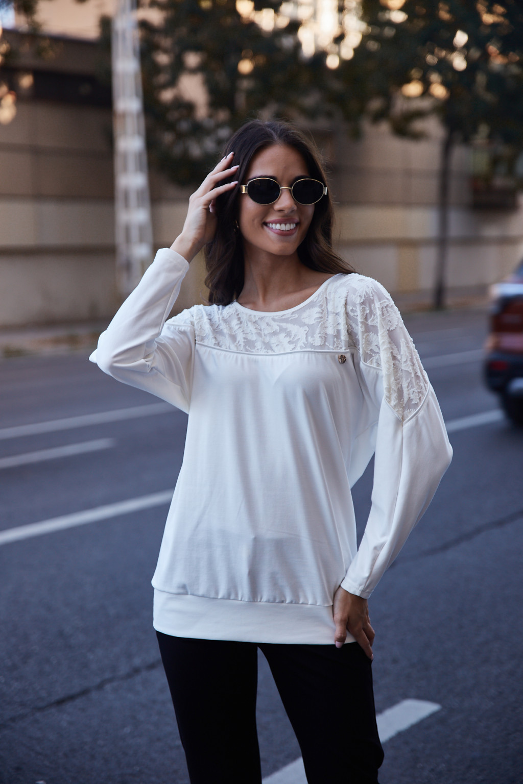 SAZZIE női felső– paszpolos szatén díszítéssel,csipkebetétes,ekrü,L,Tara X Viktori