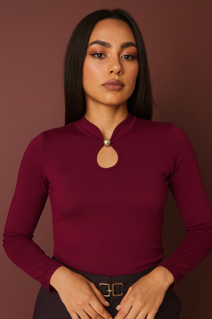 DEVYN női felső orosz gallérral és csepp kivágással – elegáns, hosszú ujjú póló,bordó,XL,Tara X Viktori