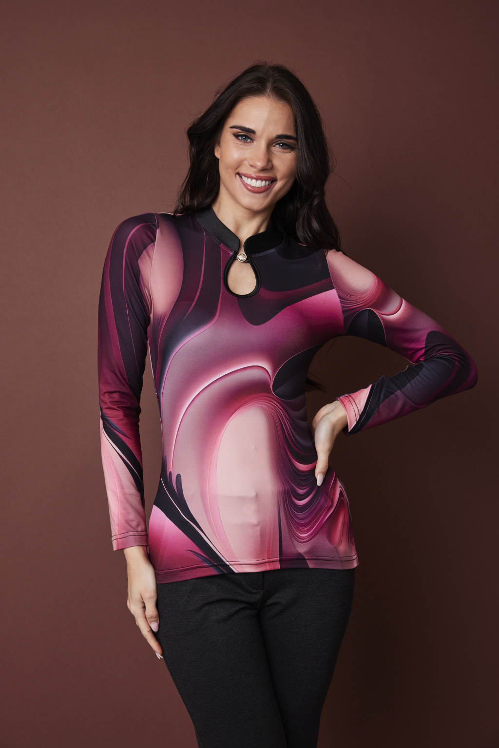 DEVYN női felső orosz gallérral és csepp kivágással – elegáns, hosszú ujjú póló,mintás,S,Tara X Viktori