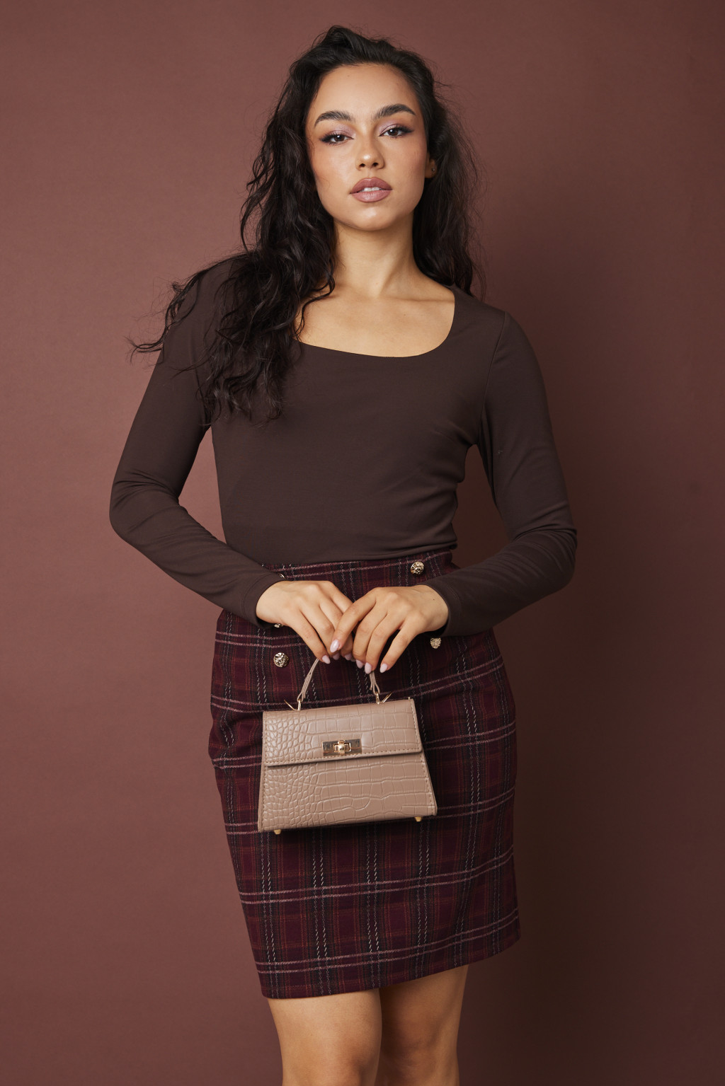 KINSELY női póló, stircelt-kocka nyakú póló,sötétbarna,M,Tara x Viktori