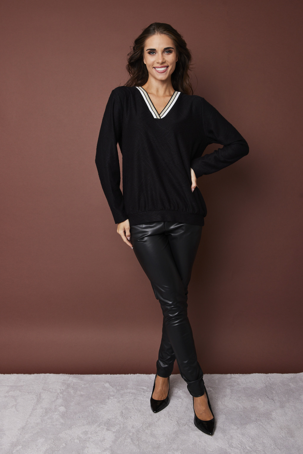 Lissabon női tunika, V-nyakú csíkos gumi passzés saját anyagából passzés aljú,tunika,fekete,L, Tara x Viktori