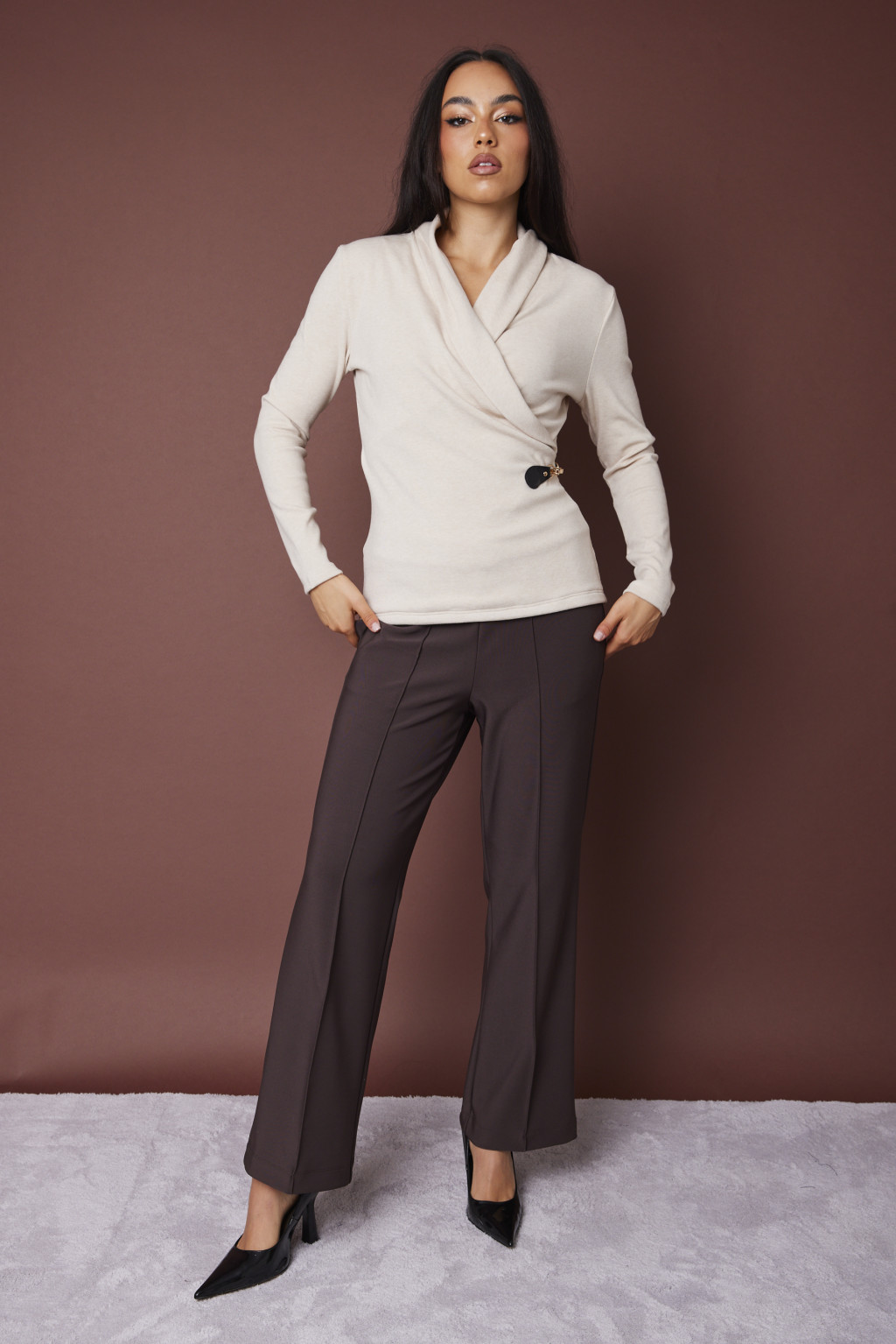 SLOAN női póló sálgallérral, átlapolt fazon, díszcsattal – elegáns, kötött felső,világosbézs,M,Tara X Viktori