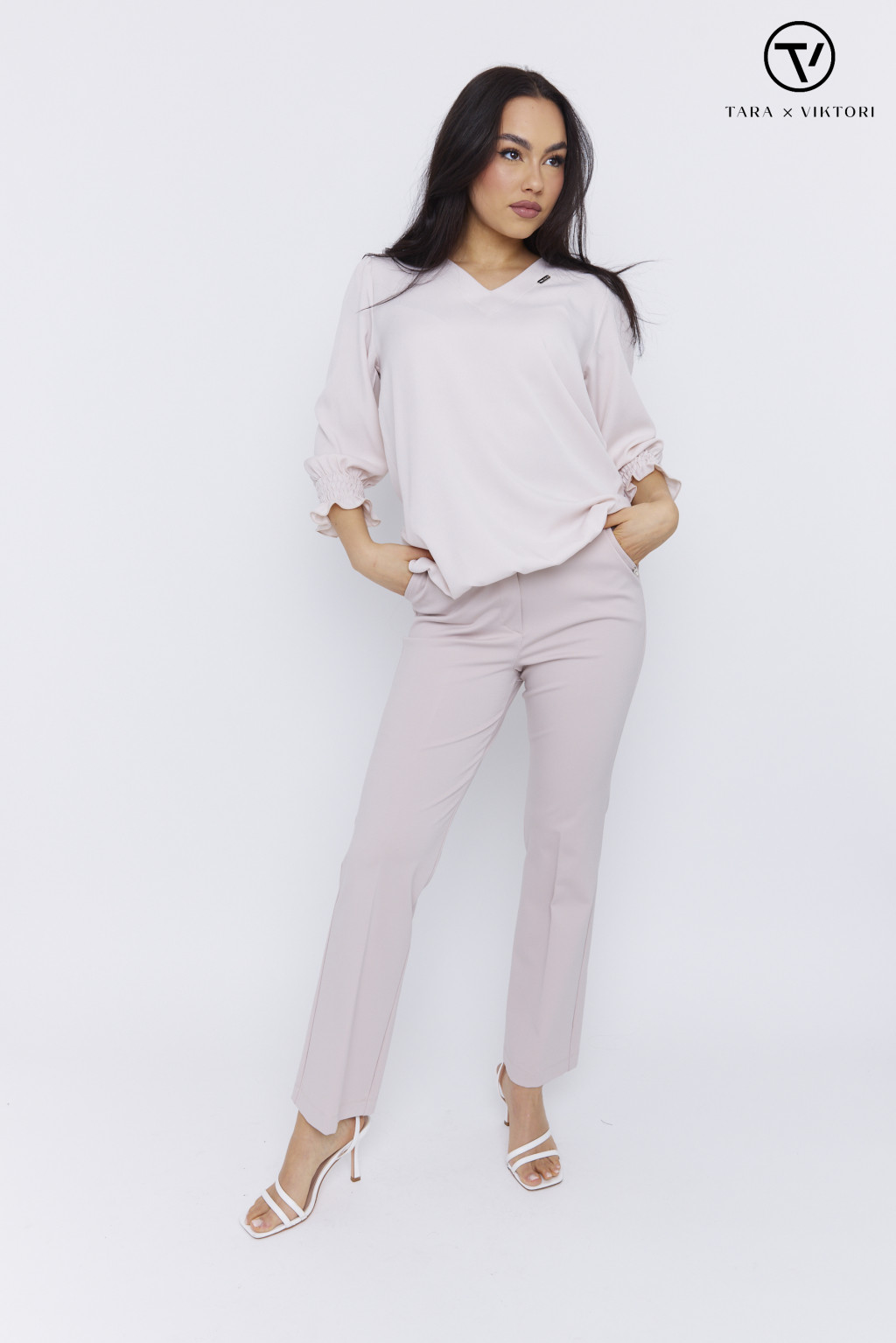 Pomona mintás női blúz V-nyakkivágással és gumírozott ujjakkal ,bézs,L-XL,Tara Collection X Viktori