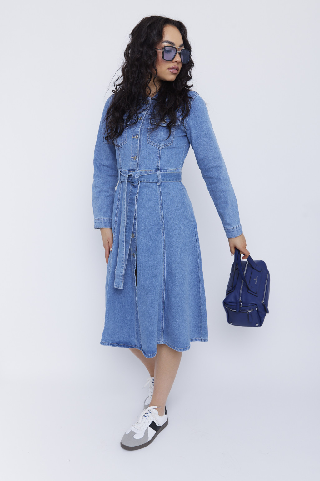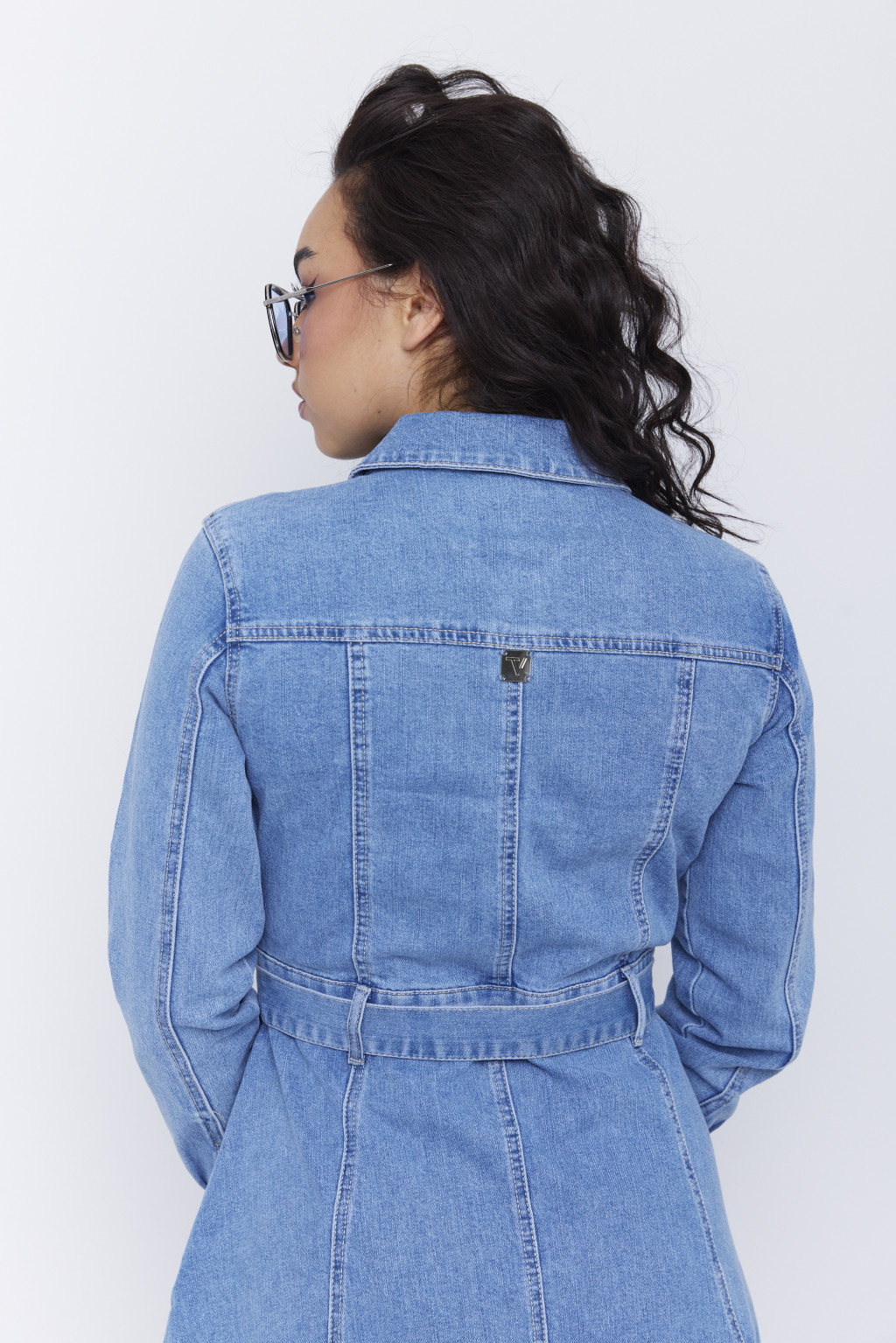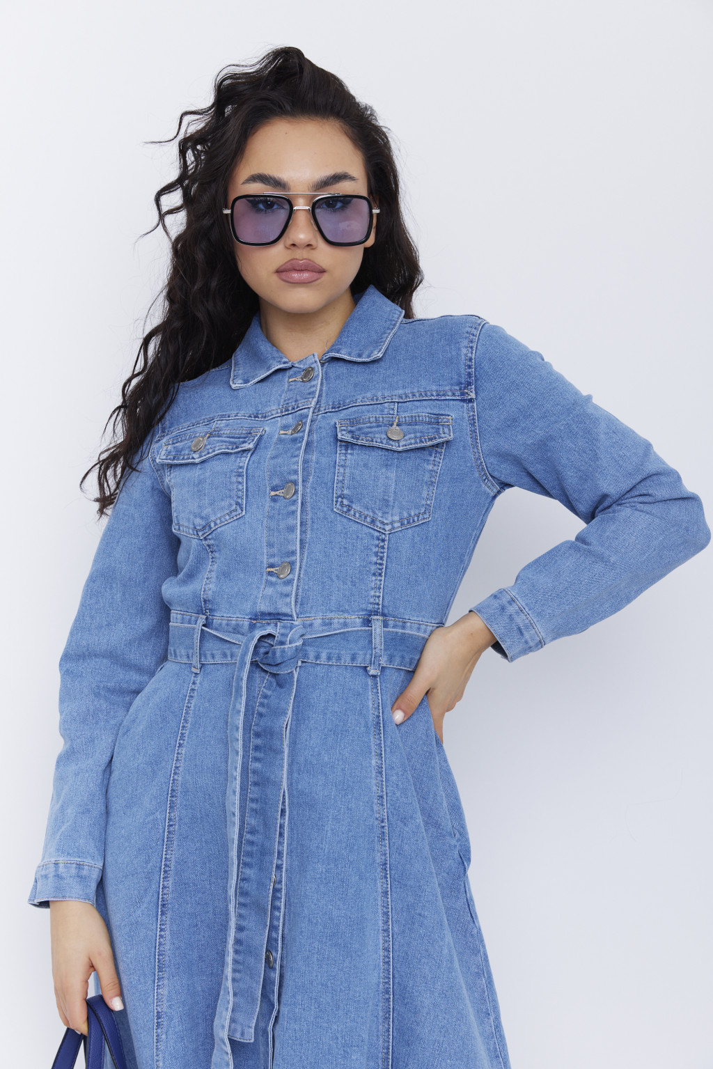 Női farmer ruha – gombos elejű, öves, galléros, elöl sliccelt ruha,kék,S,Tara X Viktori
