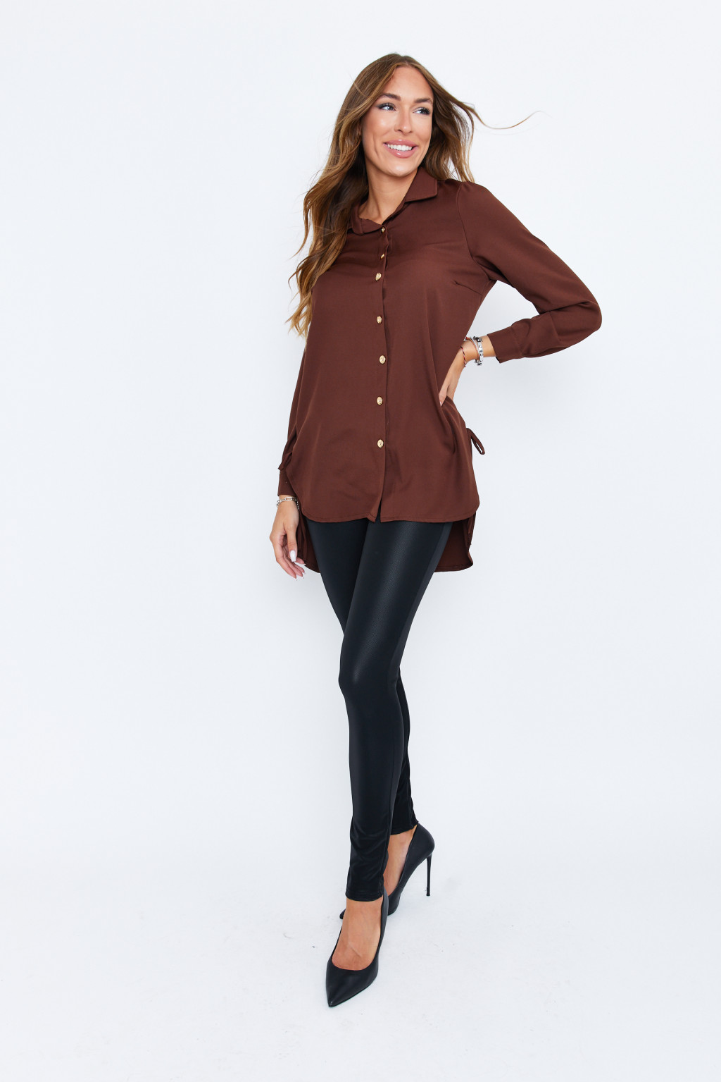 Leona női tunika, galléros bővebb női blúz masnival az oldalán,barna,S/M, Tara x Viktori, Curve Fashion
