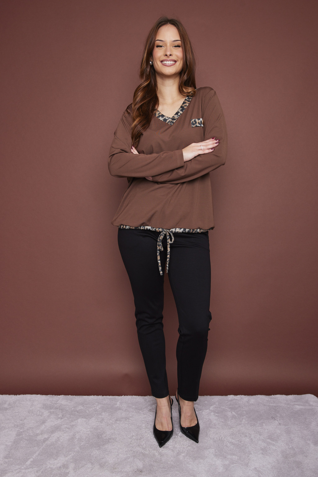 RAMI női felső, V-nyakú, megkötős aljú tunika csíkbetéttel és gombbal,barna,M,Tara X Viktori,Curve Kollekció