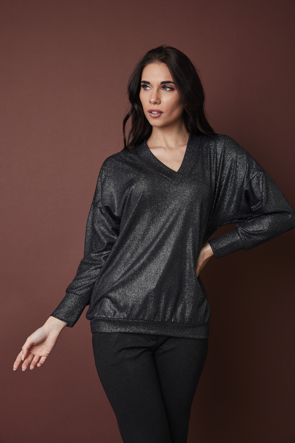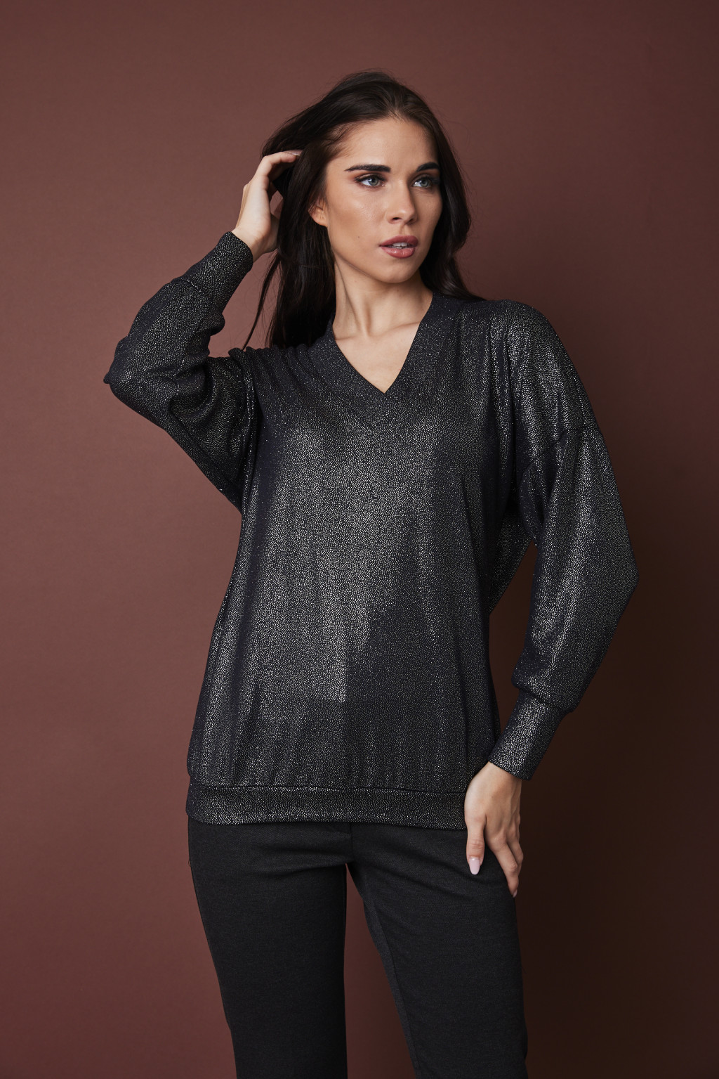 CHANTIL női felső – V-nyakú, passzés ujjú, bővebb szabású,grafit csillogó,M,Tara x Viktori,Curve Kollekció