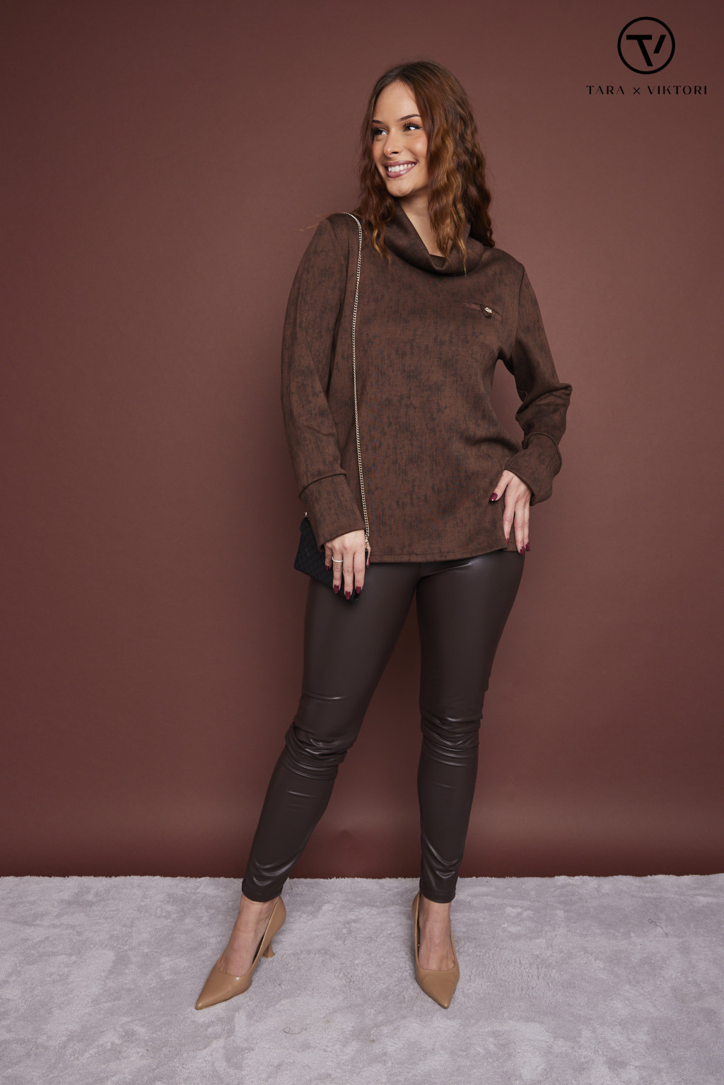 SUSAN női pulóver, kámzsás nyakú, díszzsebes pulóver,barna,L,Tara X Viktori,Curve Kollekció