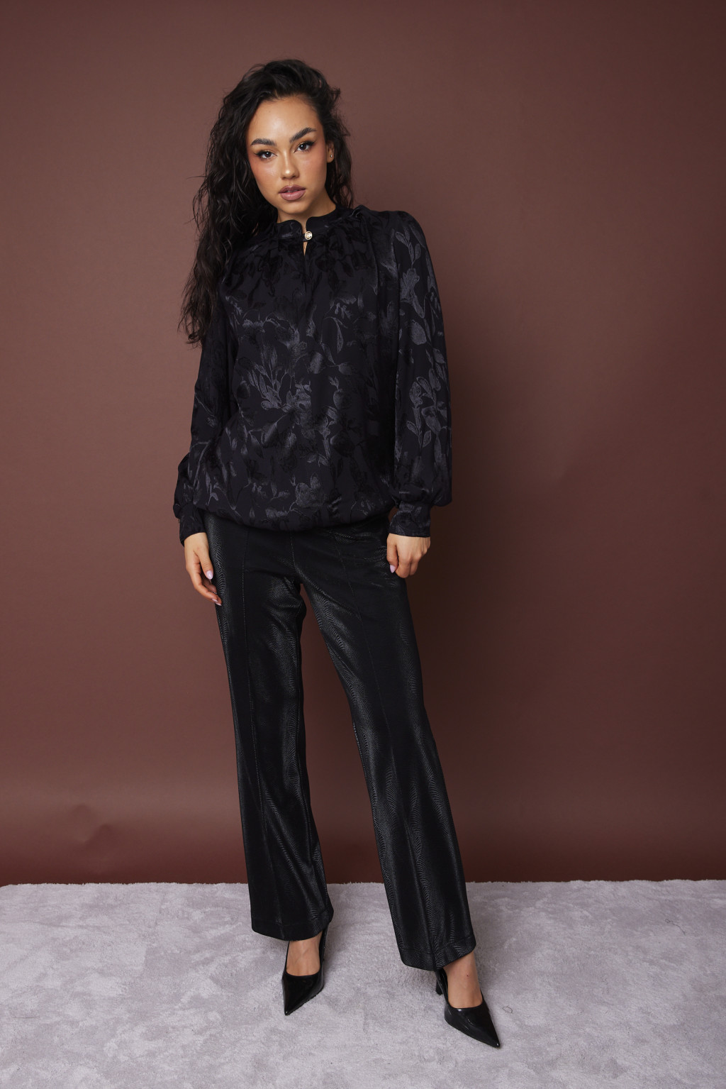 AMARA női szatén tunika állógallérral és díszgombbal,fekete,S-M,Tara X Viktori,Curve Kollekció