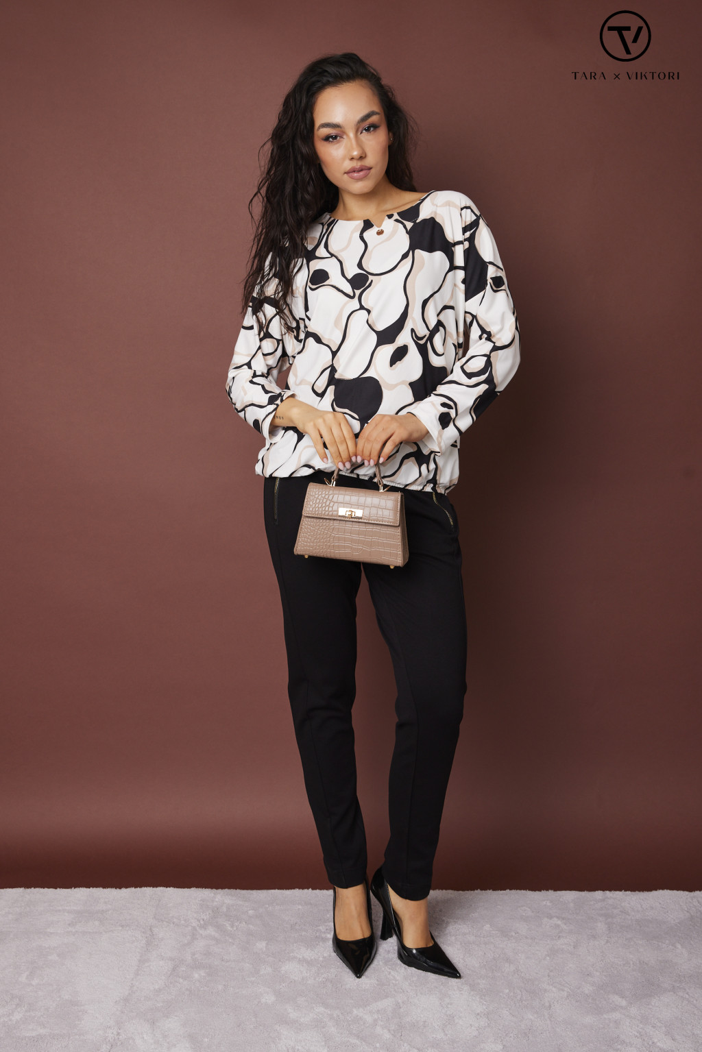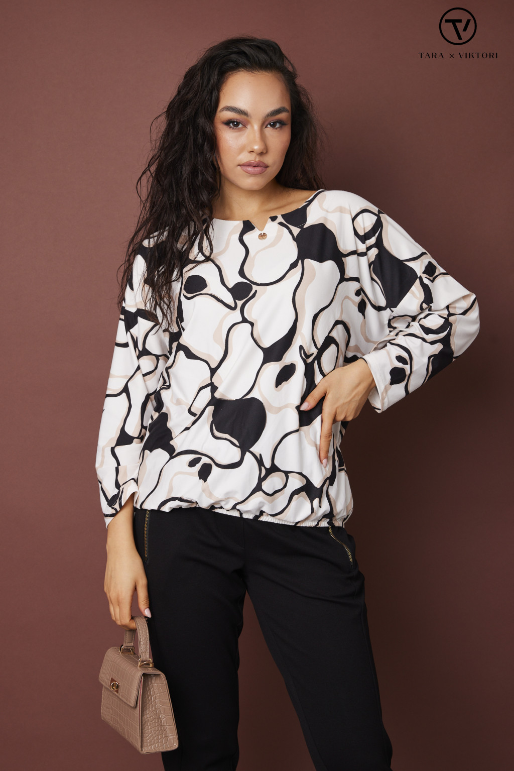 LILLY női blúz– mintás, környakas, gumis aljú blúz,S-M,Tara X Viktori,Curve Kollekció