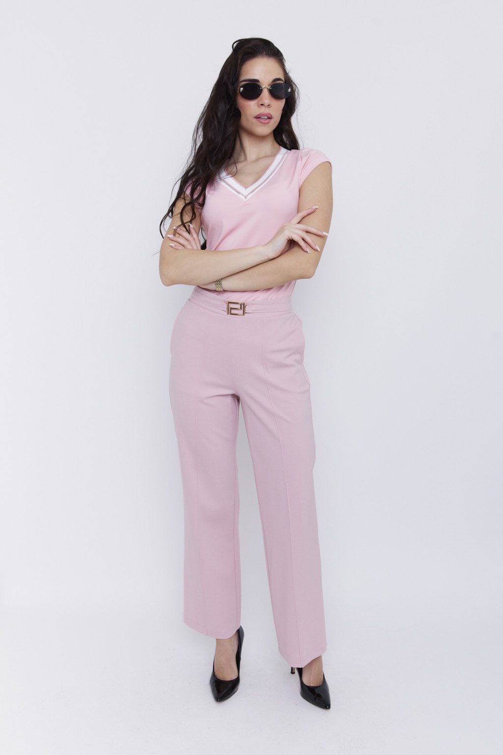 V-nyakú testhezálló női póló csíkos gumi pánttal díszítve a dekoltázsnál. Vigyél egy kis extra részletet a megjelenésedbe Trudy női felsőnkkel. Polyamid anyagból készítjük elsősorban, ami egy rugalmas pólóanyag, amelynek van tartása.
