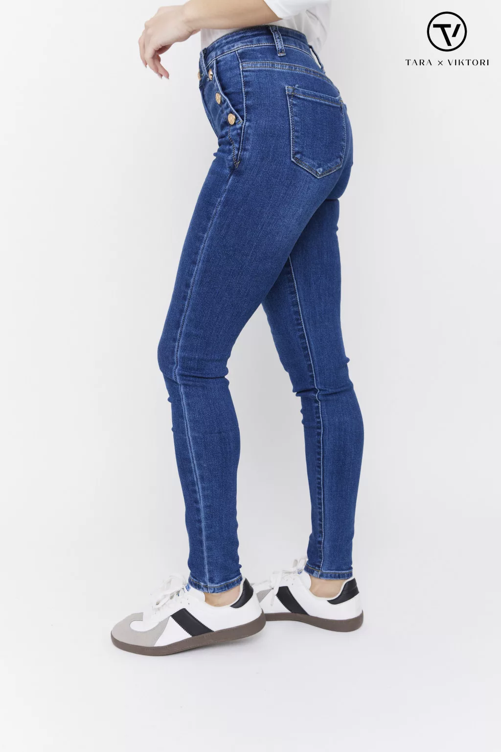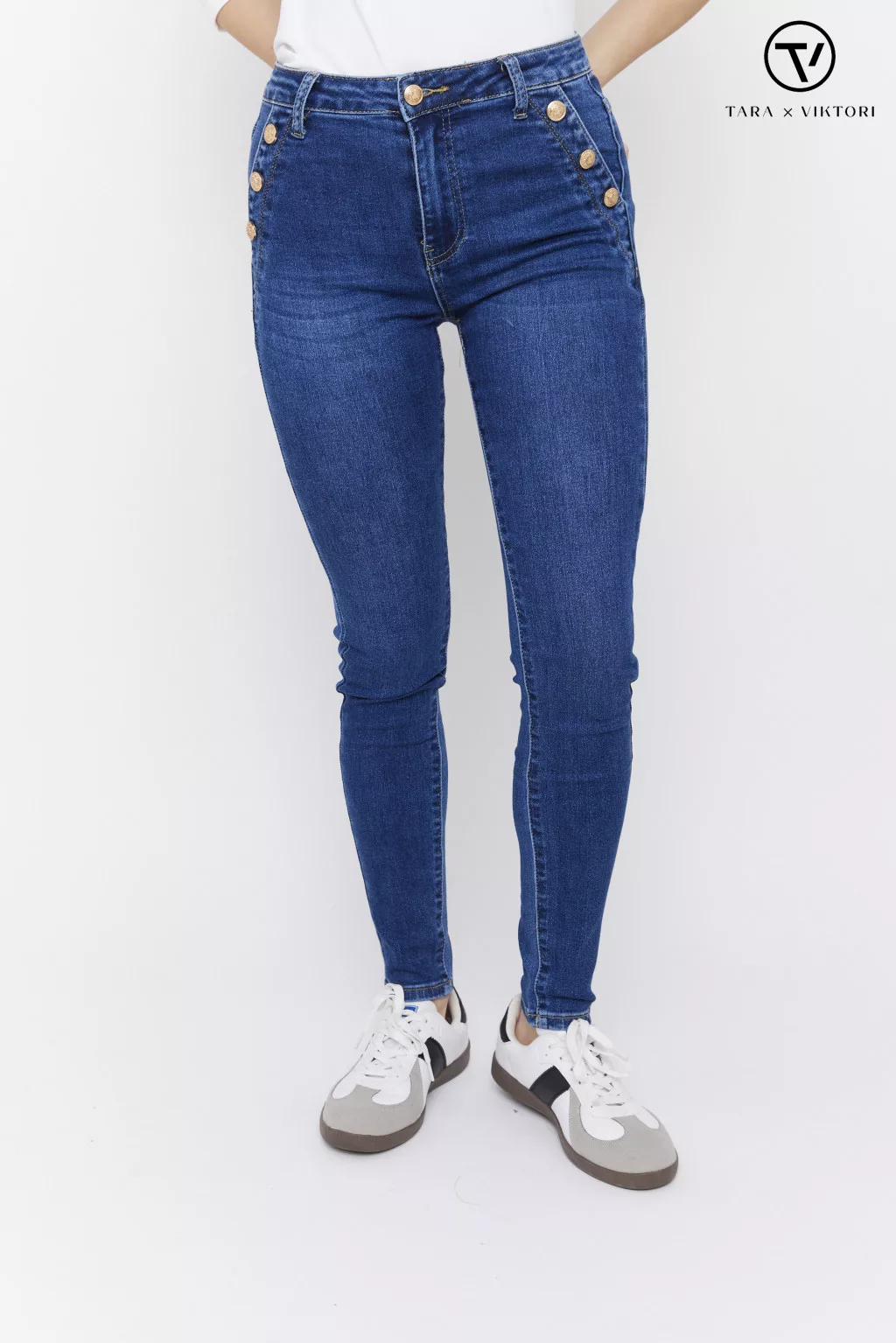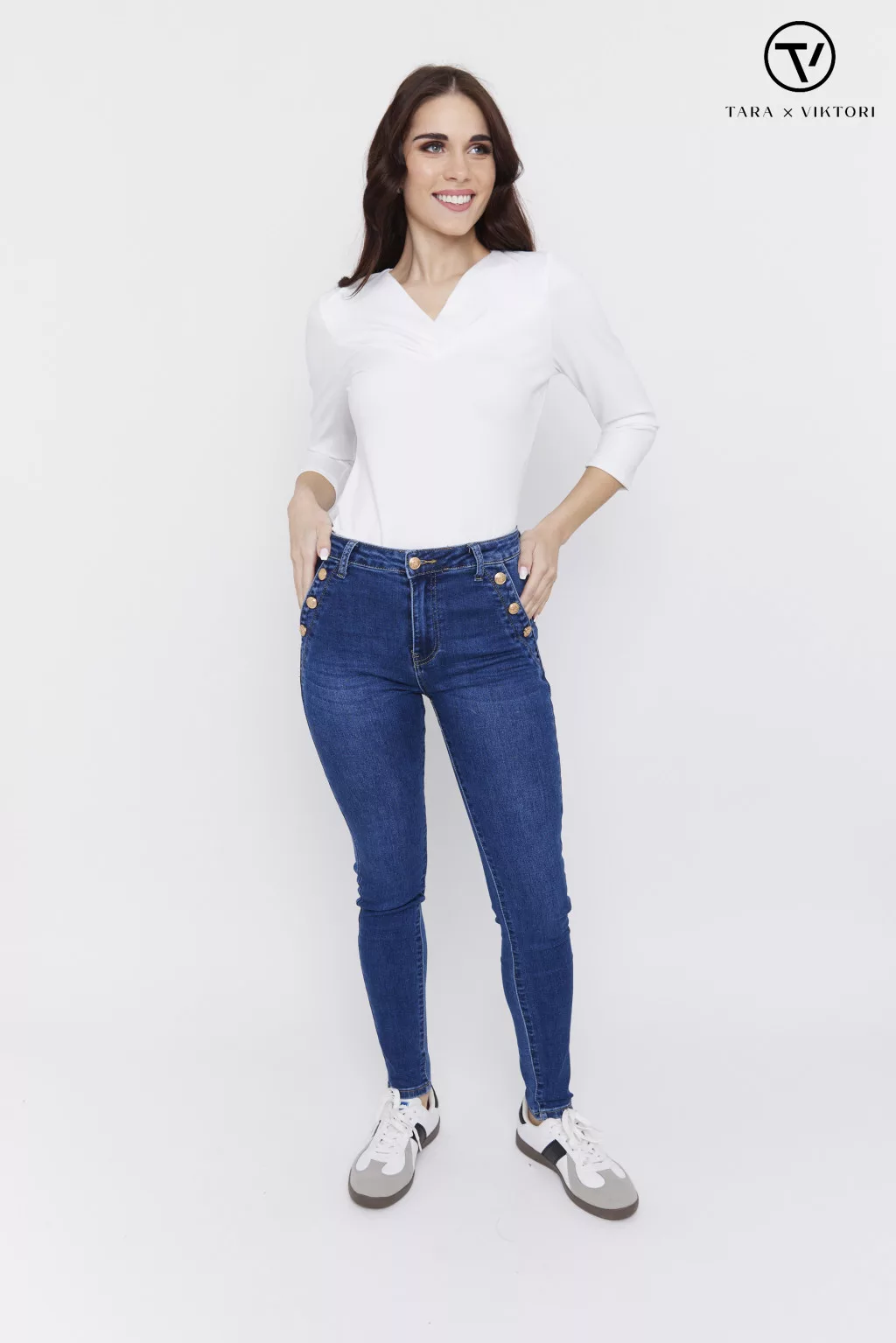 Kifejezetten alakformáló szabásával és szűk fazonjával hangsúlyos, nőies megjelenést biztosít. A magas derekú kialakítás szépen kiemeli a derékvonalat, míg az elöl elhelyezett gombos díszítés karakteres, trendi részletet ad a modellnek.