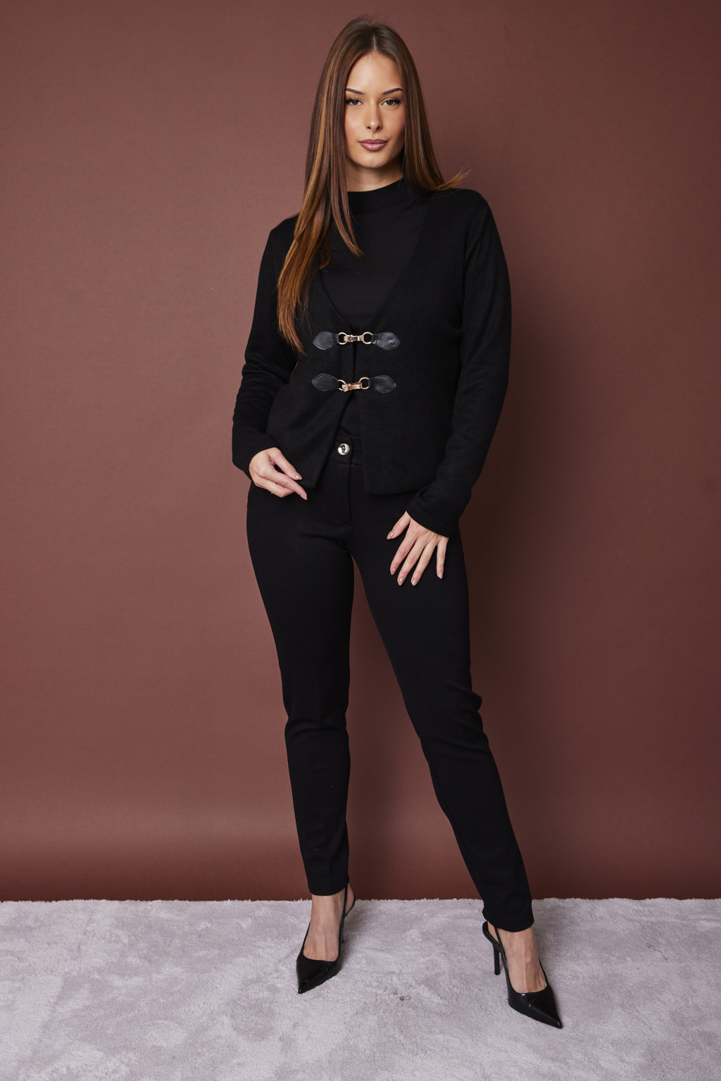 A HARPER női kardigán elegáns és stílusos darab, amely tökéletes választás a hűvösebb napokra. "V" nyakkivágása és elöl elhelyezett dekoratív csatok modern, mégis klasszikus megjelenést biztosítanak. Kellemes tapintású, kötött anyaga komfortos viseletet nyújt egész napra – legyen szó irodáról, hétköznapi rohanásról vagy egy kellemes esti programról.