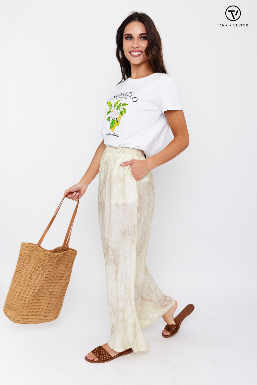 SYDNEY bő szárú női nyári nadrág – természetes hatású, lenge viselet,bézs,M-L,YOUNG & FREE