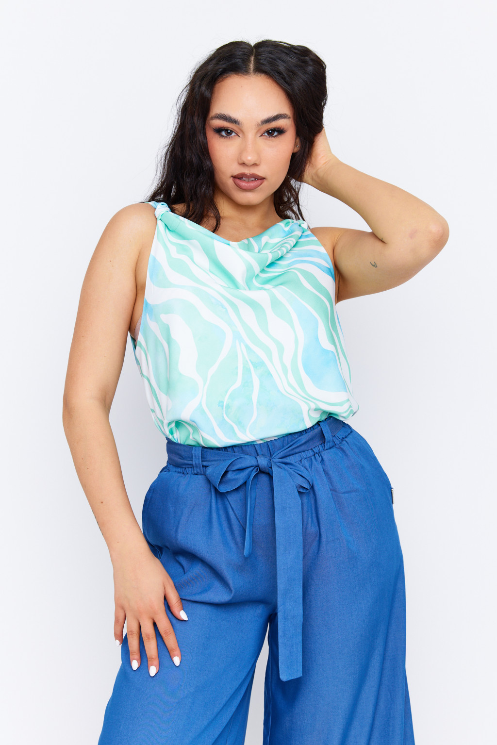 TIERA women's sleeveless top with tie straps and draped neckline – patterned