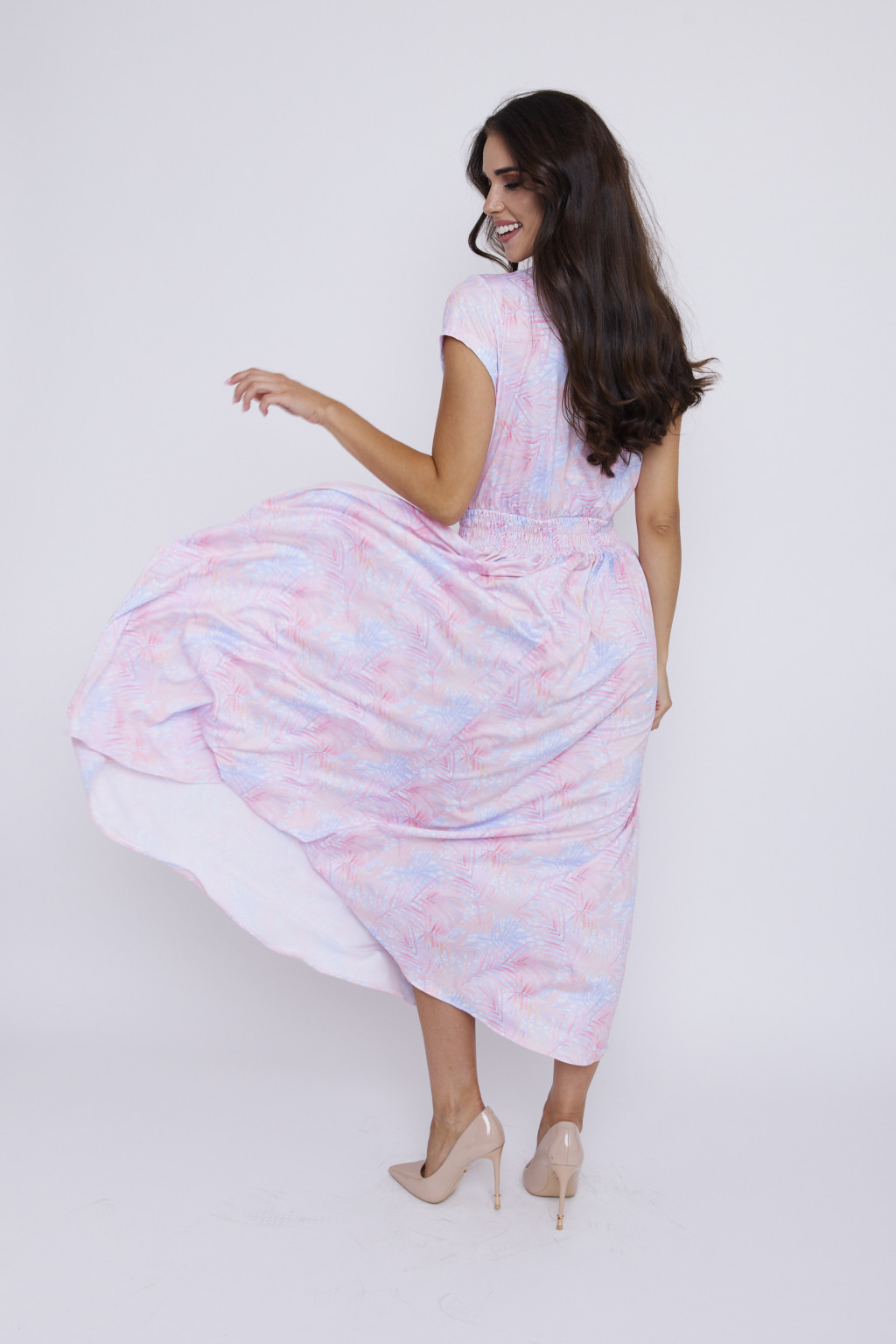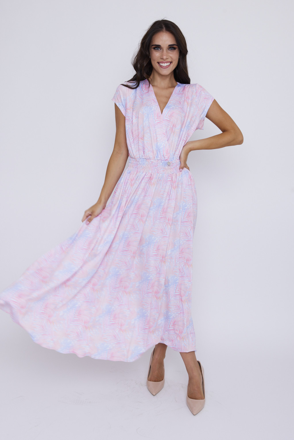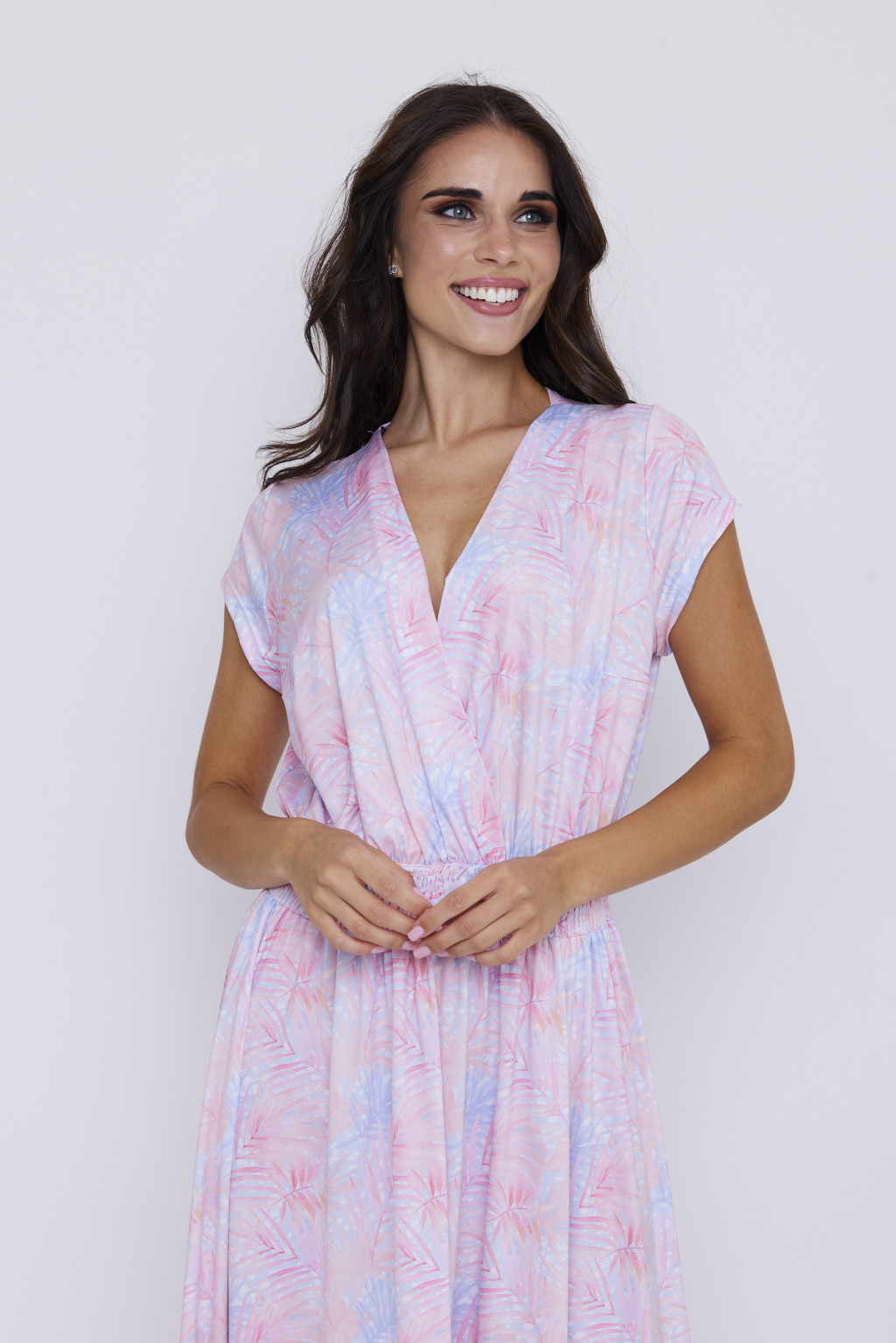 A MAITRE női ruha tökéletes választás a nyári napokra. Átlapolt felsőrészének köszönhetően nőies dekoltázst biztosít, miközben a gumírozott derékrész kényelmes illeszkedést nyújt. Légies, lenge szabásvonala és a látványos, trópusi mintázat eleganciát és frissességet kölcsönöz a megjelenésnek. Különleges eseményekre, de akár hétköznapi viseletre is ideális.
