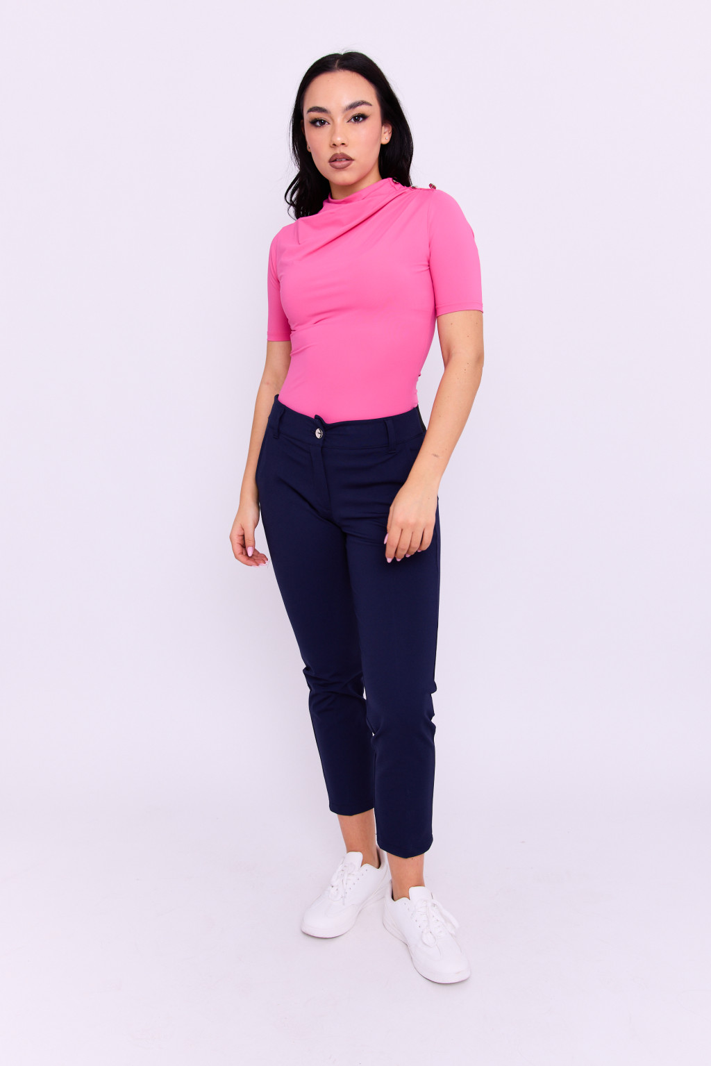 Riverine női felsőnk emlékezetes darab - a mindennapokon és a sikkes alkalmakra is tökéletes választás. Magas nyakú pólónkat különleges ráncolással és gombokkal díszítettük a váll résznél, bal oldalon. Letisztult fazon, szabászati megoldásait és az anyagválasztást illetően is egy kifonomult sziluettről beszélünk. Testhezálló szabása van.. Polyamid anyagból készítjük, ami egy rugalmas pólóanyag, amelynek van tartása.