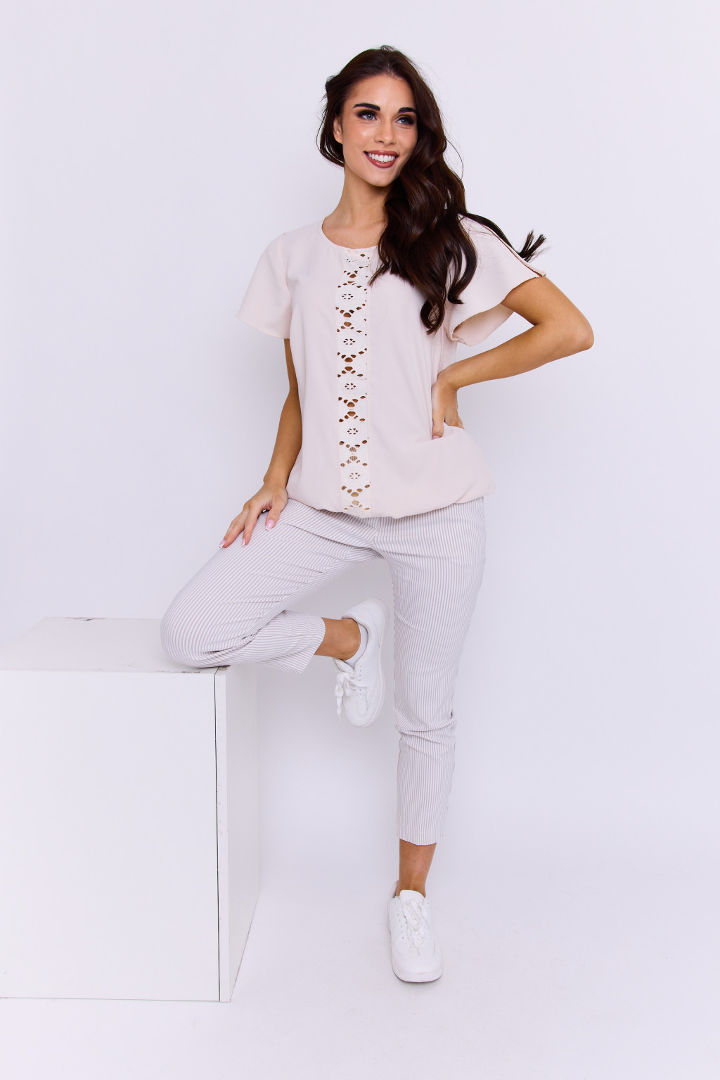 Tallula női blúz csipkebetéttel és gumis aljjal – elegáns, rövid ujjú felső,púder,S,Tara X Viktori