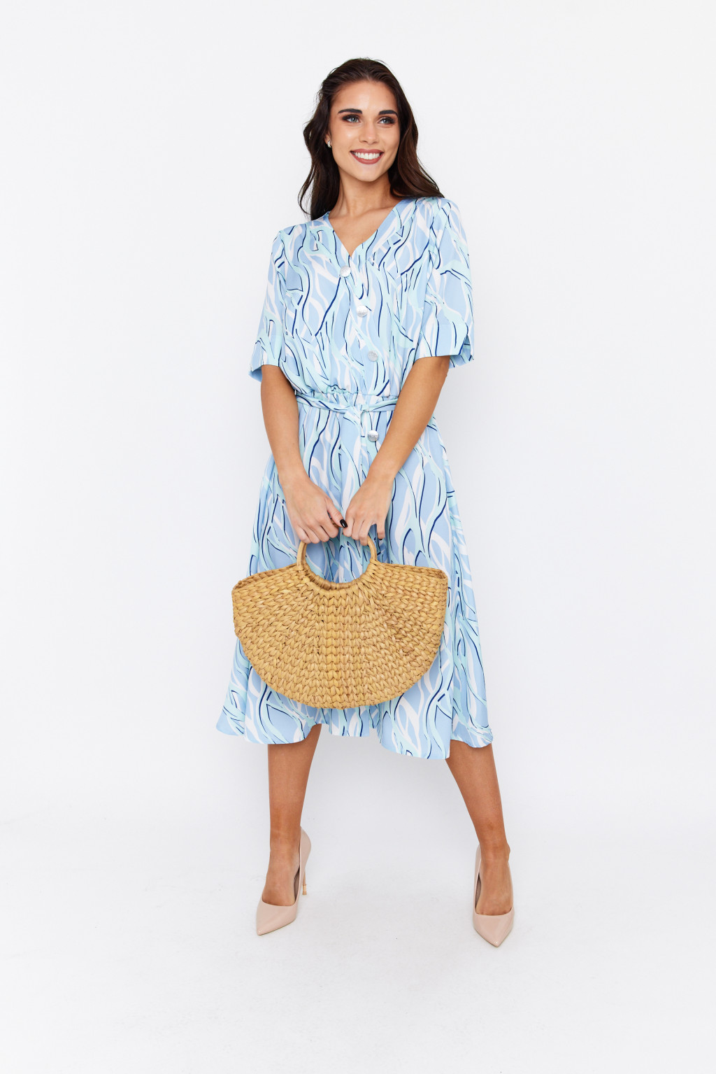 Sofi women’s dress – V-neck wrap dress with button front, elastic waist and belt