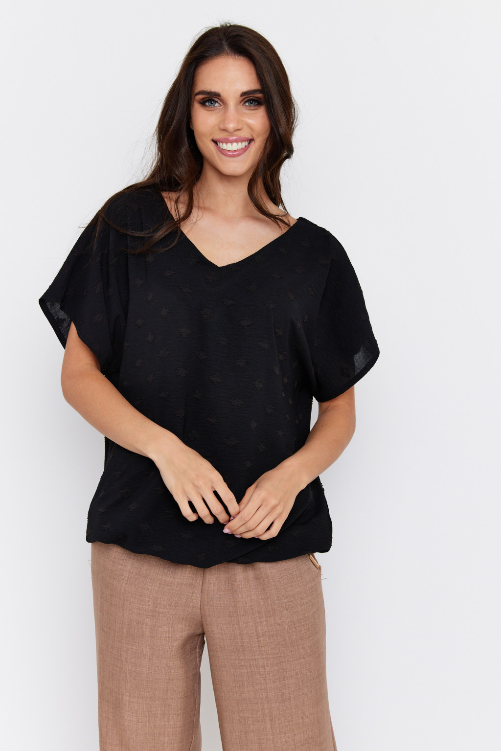 KATY women's blouse – V-neck, tie-back, loose fit crinkled hem blouse