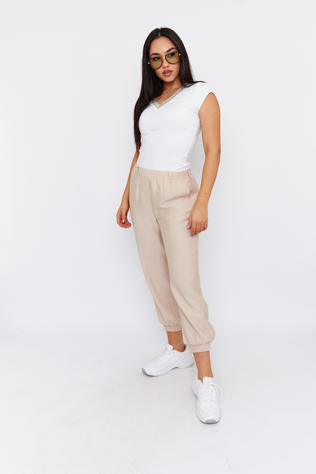 Az Elvira női jogger nadrág ideális választás a nyári szezonra! Lenvászon hatású, könnyed anyaga kellemes viseletet biztosít meleg időben. A gumis derékrész és a bokánál húzott szár garantálja a maximális kényelmet és a sportos, mégis nőies megjelenést. Praktikus oldalzsebei és hátul kialakított díszzsebei stílusos részletek. Tökéletes választás hétköznapi viseletre, kiránduláshoz vagy nyári városi sétákhoz.