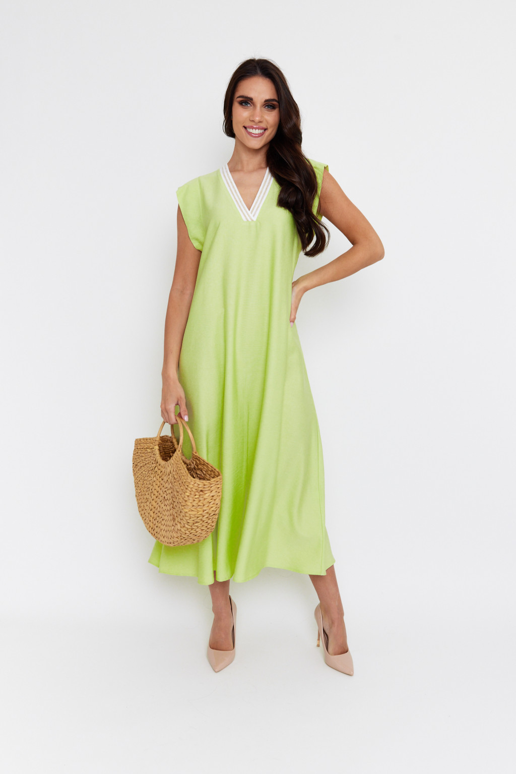 BOLZANO hosszú, A-vonalú női ruha tökéletes választás a stílusos és kényelmes megjelenéshez. Az elegáns, anyag modern, mégis időtálló megjelenést biztosít. A ruha passzés "V" nyakkivágása nőies és előnyös, míg az enyhén ejtett vállrésze és rövid ujja légies hatást kelt. Hosszított, A-vonalú szabásának köszönhetően szabad mozgást nyújt, és minden testalkathoz jól illeszkedik. Tökéletes választás irodába, nyári programokra vagy akár egy esti vacsorára.