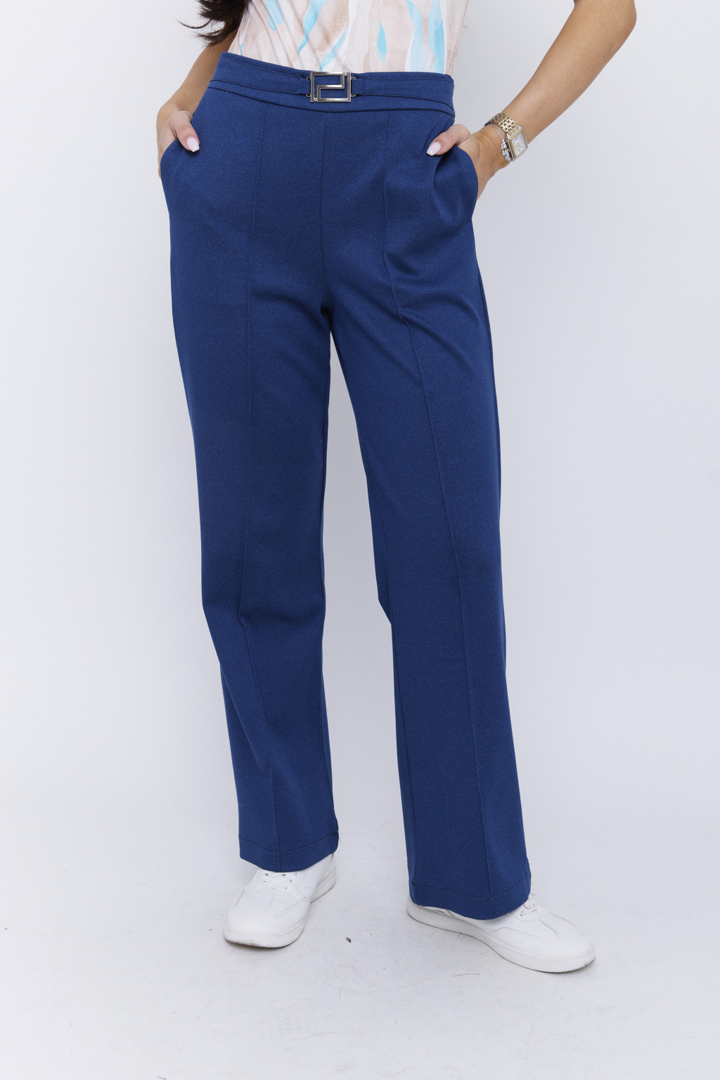 PEARL women’s tailored pants with pressed crease and gold decorative buckle – elastic back waist trousers