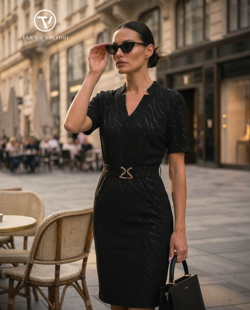 ELLA V-nyakú öves női ruha,fekete-mintás,L,TaraxViktori