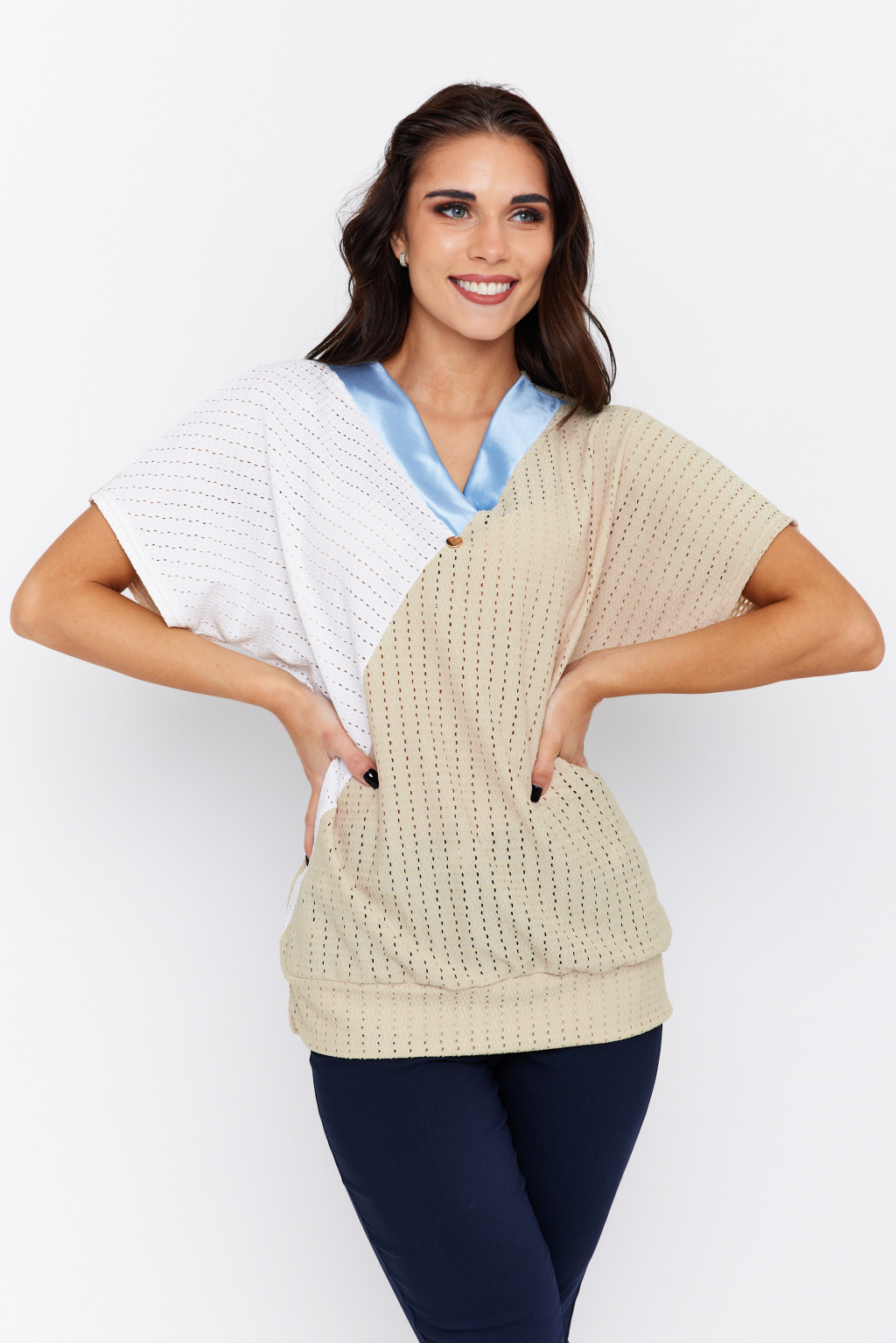 Teremtsd meg az oldottság varázsát NIM női felsőnkkel! Ez a V-nyakú, aszimmetrikus tunika könnyed, stílusos érzésekkel ruház fel, szabászati megoldásának köszönhetően egyszerre játékos és nőiesen lezser benyomást kelt. Az eltérő színű alkatrészek teszik még különlegesebbé, valamint passzés ujj és -alj díszíti.