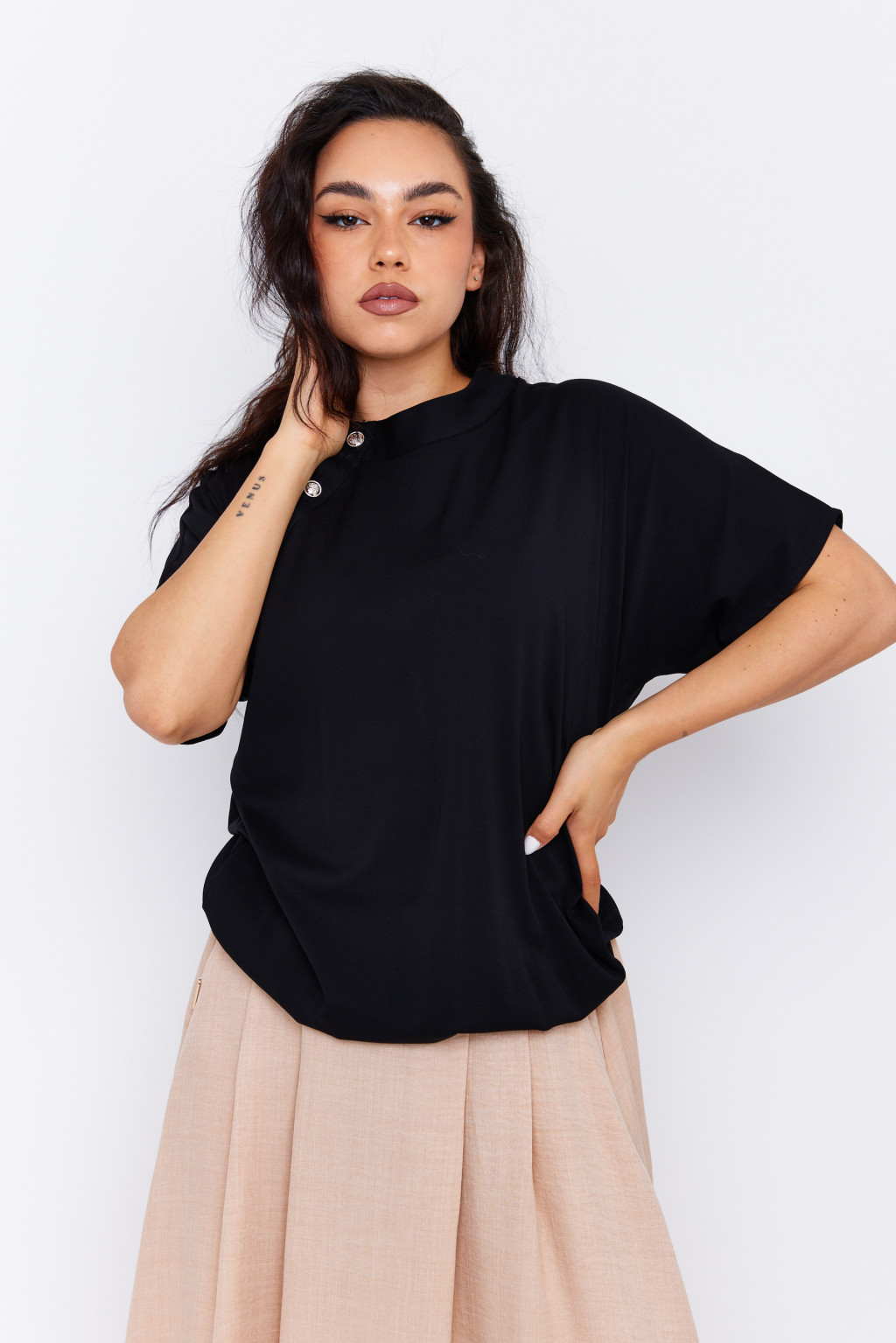 AYLA jobb oldalt gombos, állógalléros, gumis aljú tunika,fekete,L,Tara X Viktori,Curve