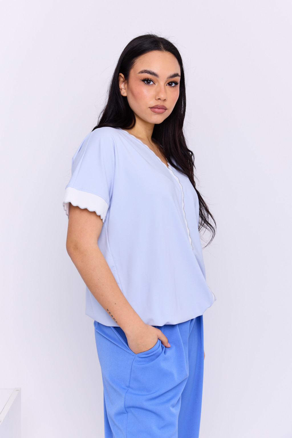 BRENDA női passzés blúz kontrasztos szegéllyel,világoskék,L,Tara X Viktori,Curve