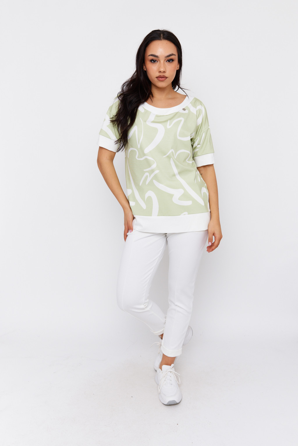 A BERTINA női tunika tökéletes választás azoknak, akik szeretik az egyedi mintázatú, mégis kényelmes darabokat. A tunika puha, kellemes tapintású anyagból készült, rövid ujjú fazonnal, valamint széles, kontrasztos szegéllyel az ujjvégeken és a derékrészen. Laza szabása miatt ideális hétköznapi viseletre, de akár sportosabb outfitekhez is párosítható. Tökéletesen kombinálható fehér vagy világos nadrággal, sportcipővel vagy balerinacipővel.