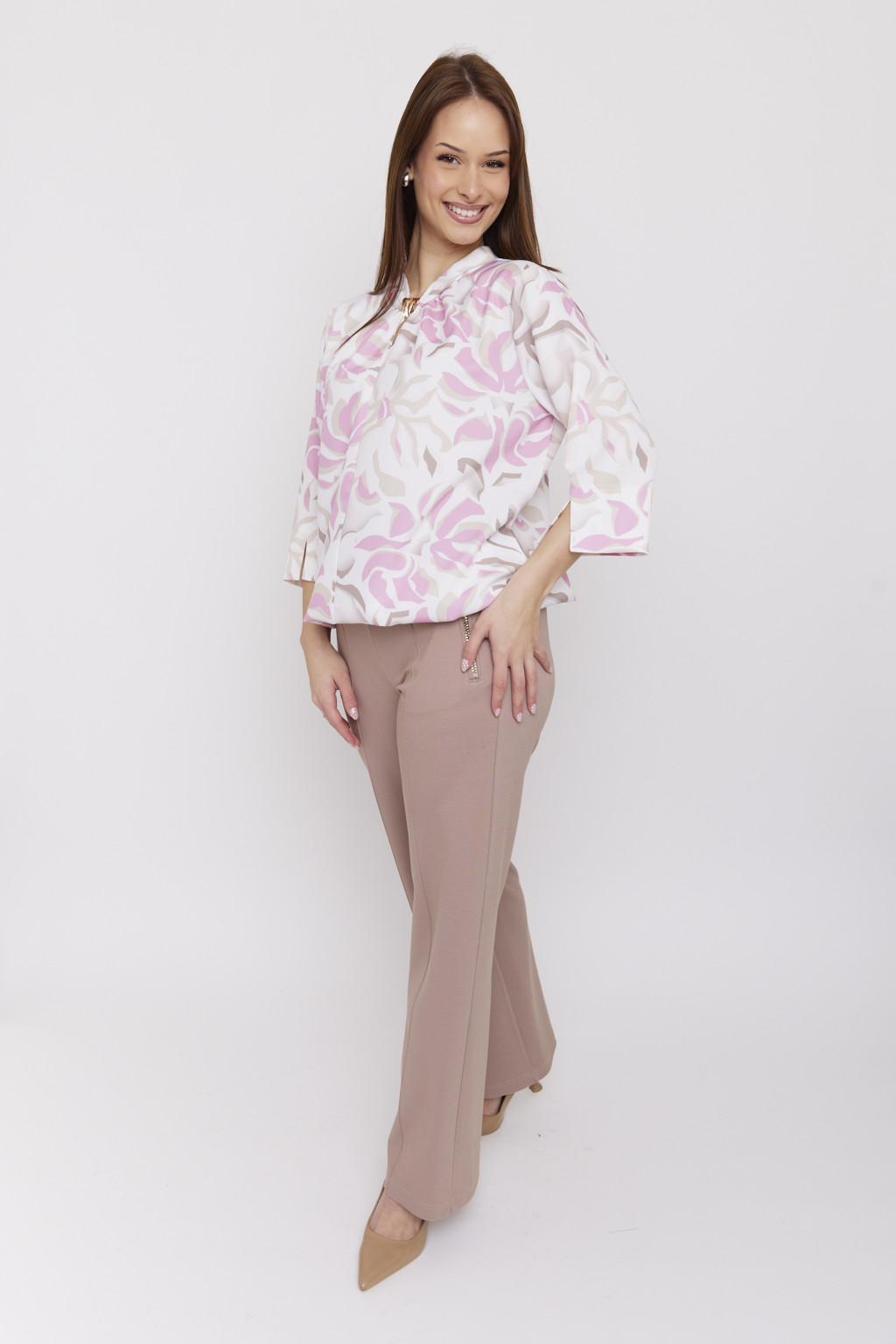 BELLY női blúz– gumis aljú, díszcsatos, mintás alkalmi blúz,L,Tara X Vitkori