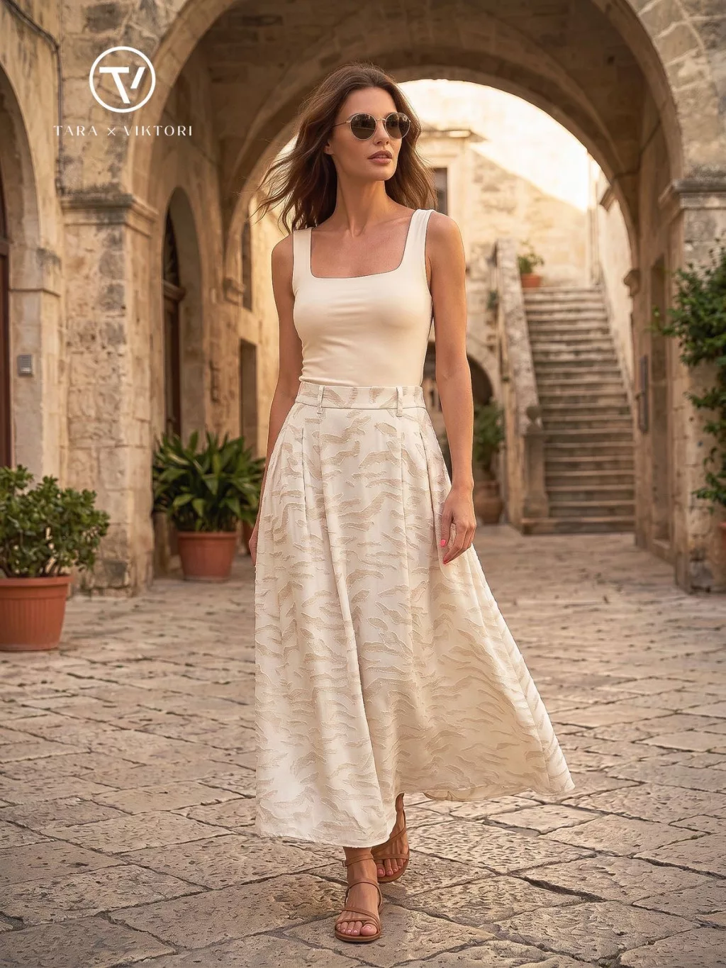 KARIN A-vonalú hosszú női szoknya zsebekkel és gumis hátrésszel,ekrü-bézs,M,Tara X Viktori